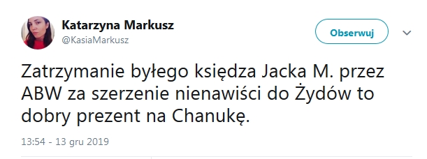 Dziennikarka Jewish Telegraphic Agency oraz portalu Jewish.pl, nominowana do Nagrody POLIN 2019, Katarzyna Markusz napisała dziś na Twitterze: